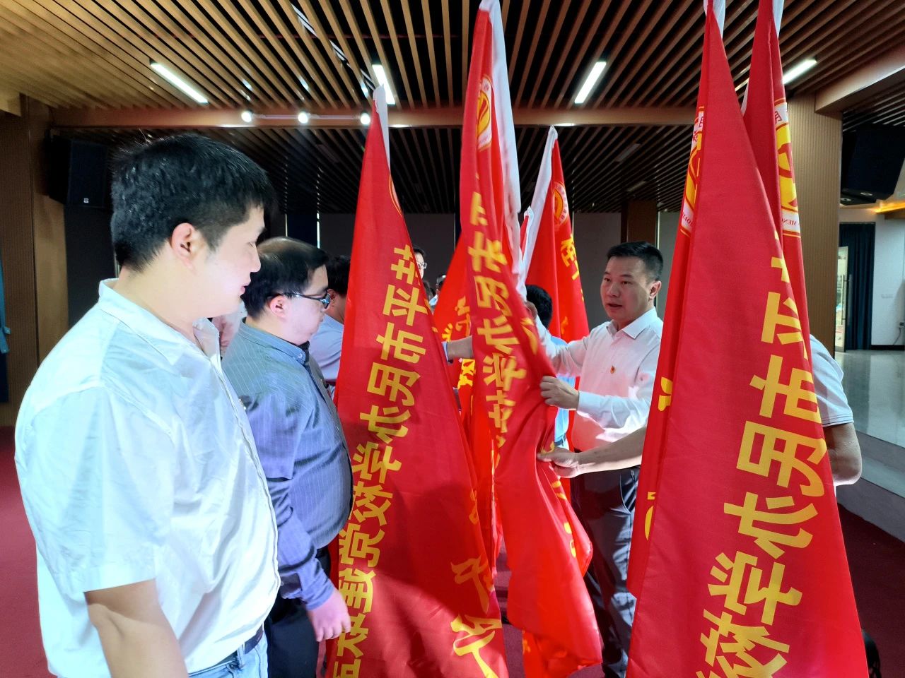 图↑ 党建指导员为民办学校党建联盟成员学校党支部授党员志愿服务队队旗