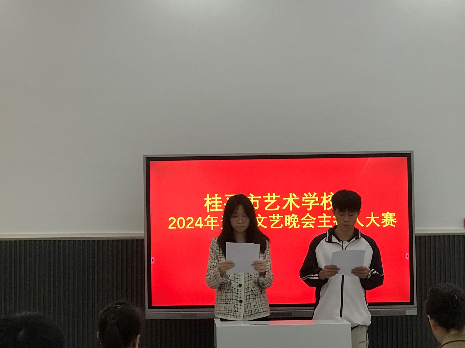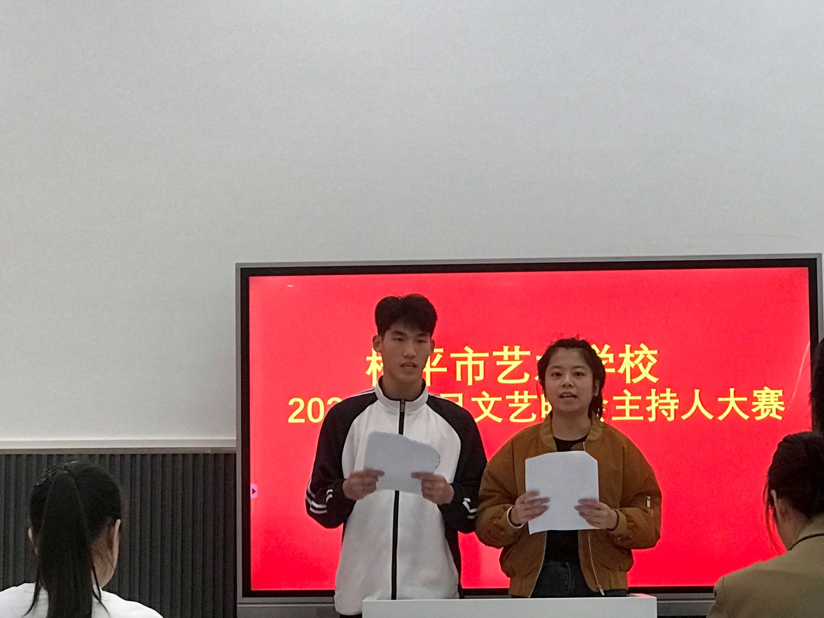 参赛者自行搭档,模拟主持。主要考察同学们的普通话是否达标,口语表达是否清晰达意,搭档主持过程中交流是否顺畅。