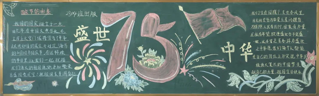 为庆祝中华人民共和国成立75周年,桂平市艺术学校精心策划了一场别开生面、创意迭出的主题板报大赛,艺校学子们以笔为舟,以心为帆,深情地在一块块黑板上勾勒出了一幅幅色彩斑斓、情感饱满的爱国图景,不仅生动展现了他们对伟大祖国的深情厚谊,更淋漓尽致地传达了新时代青少年蓬勃的爱国情怀与昂扬向上的精神风貌。这场活动,如同一场视觉与情感的盛宴,让爱国情怀在艺校校园内激荡回响,熠熠生辉。